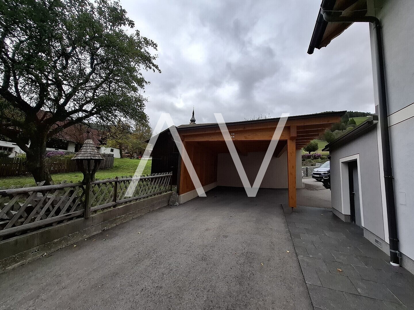 Eine Garage sowie ein neu errichtetes Carport bieten dem Fuhrpark Ihrer Familie einen sicheren Abstellplatz.